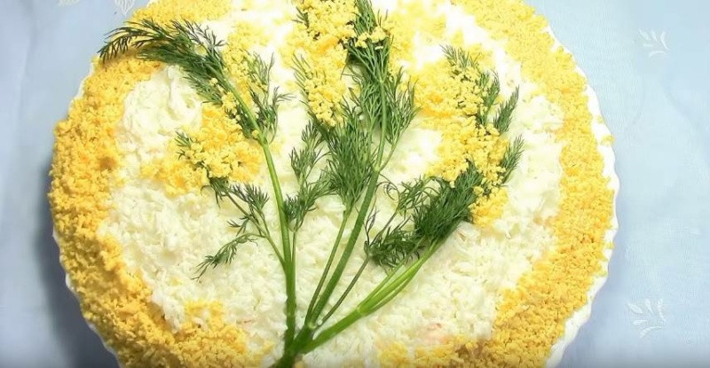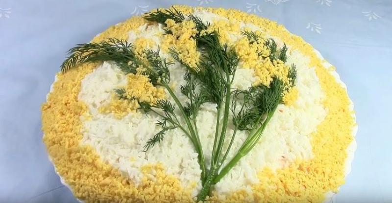 7. Теперь выкладываем сверху веточки укропа и верхушки присыпаем оставшимся желтком. Так создаётся ощущение настоящих соцветий Мимозы.