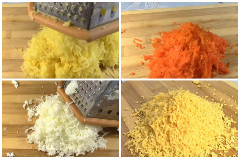 3. Яйца необходимо разделить на белок и желток. Первое натираем на крупной тёрке. Далее аналогичным образом поступаем с морковью и картофелем. Только крошим каждый продукт в разные тарелки. Есть ещё вариант тереть всё непосредственно в блюдо, где будет салат, но здесь делает каждый как хочет.