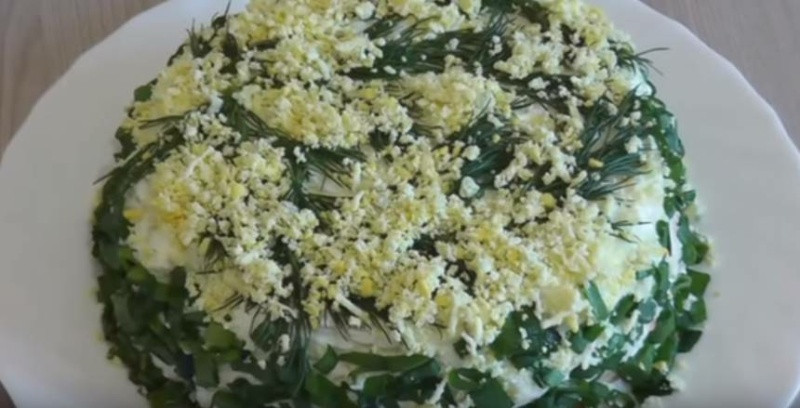 7. Ну вот и подошли к концу. Остаётся только натереть на мелкой тёрке желток, который мы откладывали, и украсить всё зеленью. После чего убираем салат настаиваться в холодильник примерно на 2 часа – этого должно хватить.