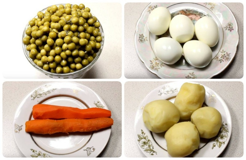 1. Сразу подготавливаем все необходимые ингредиенты. Горошек надо процедить, для этого просто вываливаем его с банки на дуршлаг и дожидаемся пока стечёт основная жидкость. Яйца, морковь и картофель отвариваем до готовности, а после чистим.