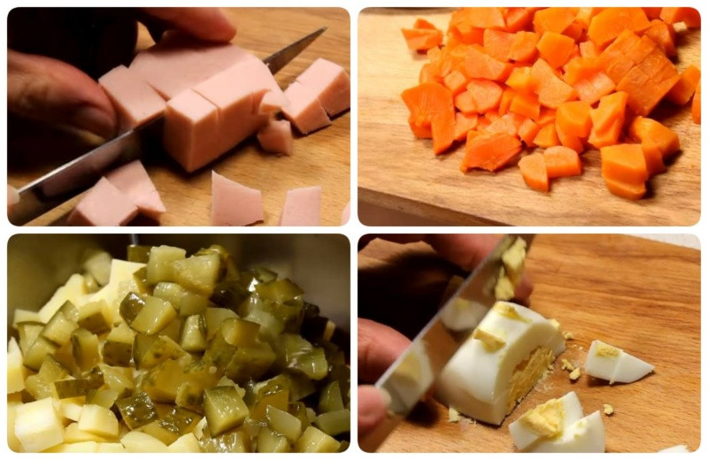 2. Теперь начинаем нарезать продукты. Крошим всё средним кубиком, включая колбасу, и складываем в общую миску. Горошек тоже перекладываем к продуктам. Касаемо яиц, то отделять белки от желтков нет необходимости. Также в случае если огурцы сильно сочные, то лучше их оставить на некоторое время в дуршлаге, дабы стекла лишняя жидкость. Иначе салат потом просто потечёт.