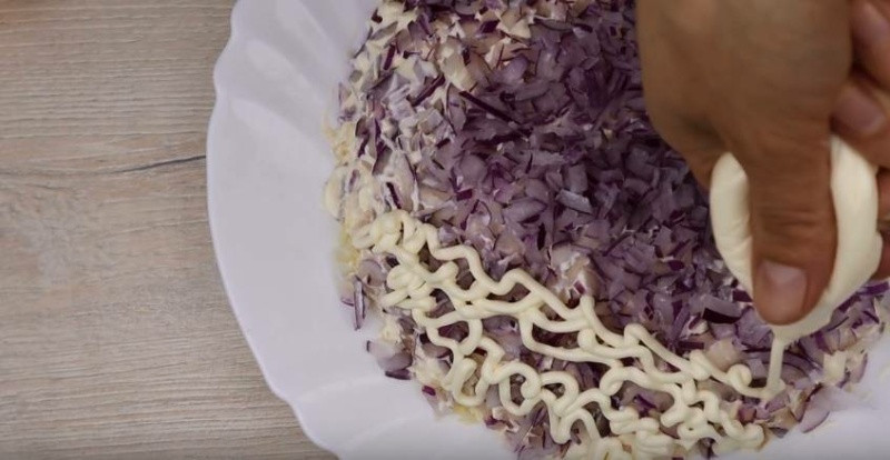- Небольшая сеточка майонеза (чтобы первый слой пропитался ещё и снизу)