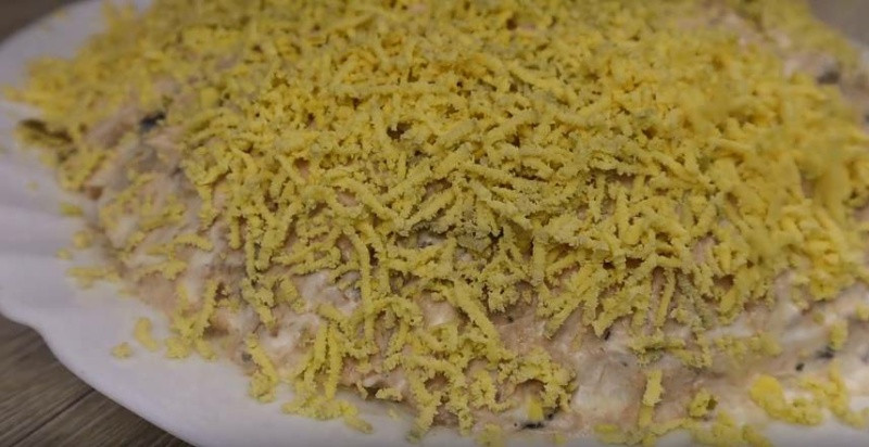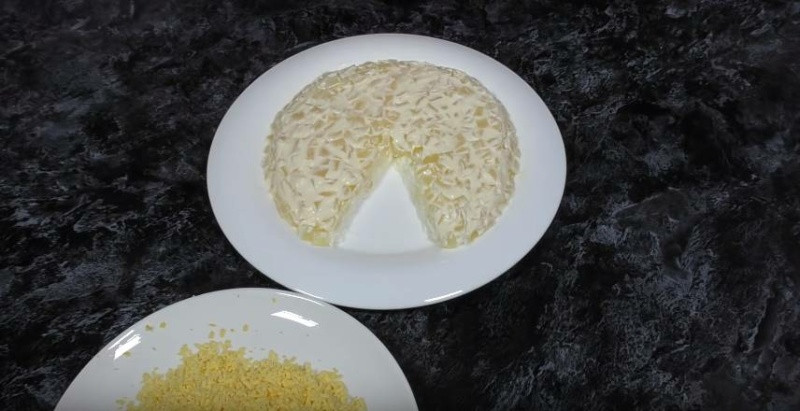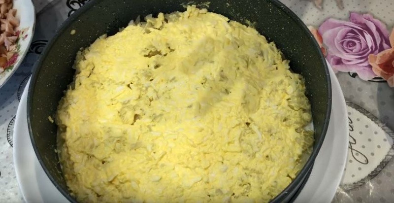 7. Ну и в завершении посыпаем всё натёртым желтком. Тут тоже не нужен майонез, потому что ингредиент и так будет хорошо прилипать к прошлому слою.
