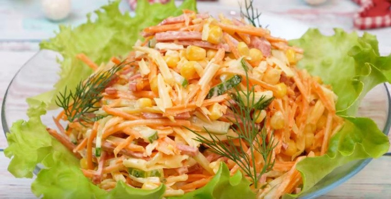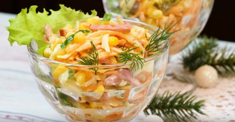 4. Остаётся теперь только добавить в чашу к продуктам консервированную кукурузу, майонез и всё перемешать. Также можете подсолить по вкусу, но учтите, что колбаса, сыр итак солёные – не переборщите. А вообще уже всё готово!