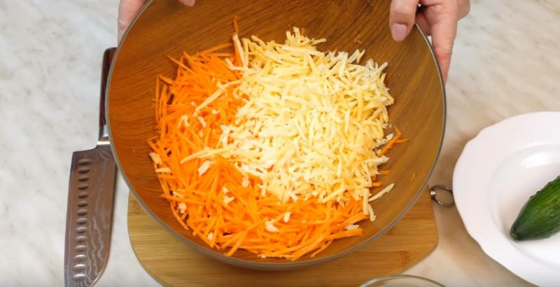 1. Морковь очищаем и хорошо промываем под проточной водой. Затем берём тёрку для морковки по-корейски (желательно с мелким сечением) и натираем на ней овощ прямо в общее блюдо. Следом трём сыр, только уже на обычной крупной тёрке.