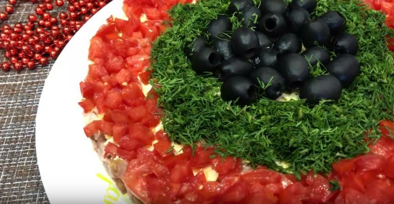 5. Внутри кольца из помидор делаем ободок из мелко нарубленного укропа или другой зелени, а посередине уже выкладываем маслины. Убираем салат в холодильник пропитаться на час и подаём к праздничному столу.