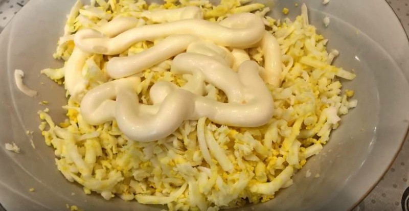 1. Первым делом отвариваем яйца, а затем натираем их на обычной тёрке. К ним же добавляем тёртые плавленные сырки и передавленный через пресс чеснок. Заправляем всё майонезом и хорошенько перемешиваем. Только не жалейте соуса, т. к. эта смесь будет выступать в роли пропитки для каждого слоя.