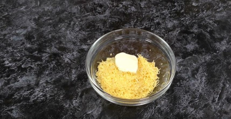 3. Берём твёрдый сыр, натираем его на мелкой тёрке и к нему через пресс выдавливаем чеснок. Затем всё это остаётся заправить 1 ст. л. майонеза и перемешать.