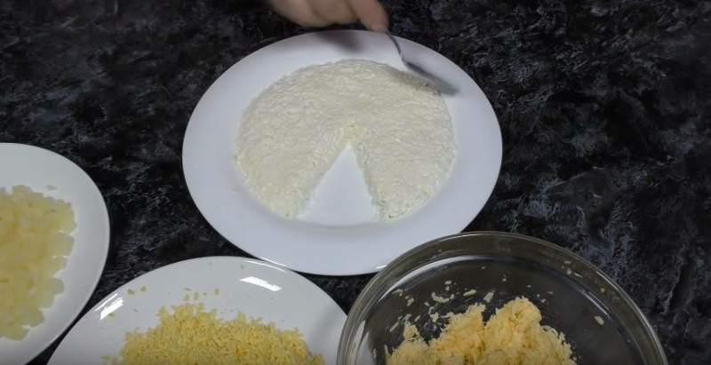 1. Занимаемся яйцами. Сразу откладываем 2 шт. для мышек, а остальные разделяем на белок и желток. Затем натираем и то и другое на мелкой тёрке но в разные миски, т. к. у нас будут отдельные слои из каждой части.