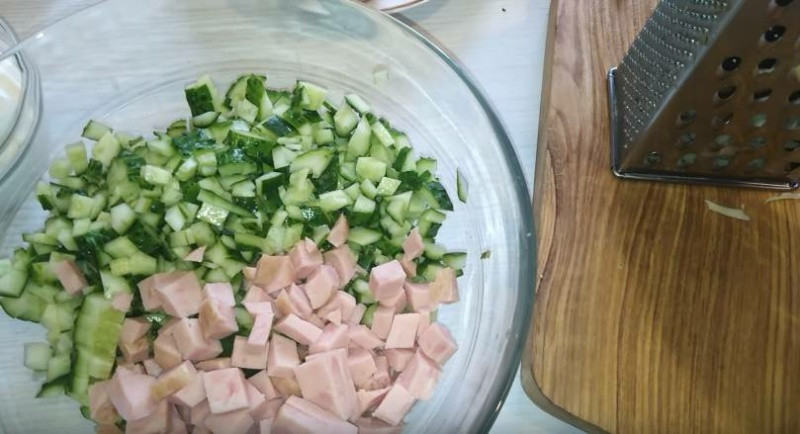 1. Изначально подготавливаем все продукты. Огурцы нарезаем мелким кубиком, яйца и сыр трём на тёрке (последнее на мелкой), а лук мелко крошим.
