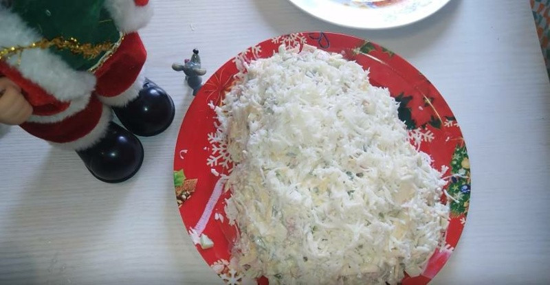 4. Ну вот все продукты подготовлены, настала пора собирать наш салат. Первым слоем на блюдо выкладываем яичный белок и придаём ему форму головки сыра, только с отрезанным кусочком. После чего совсем чу-чуть присаливаем и промазываем тонким слоем майонеза.