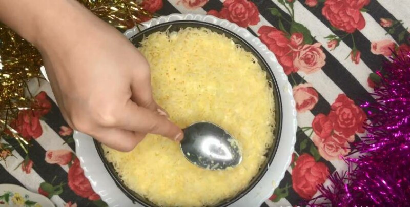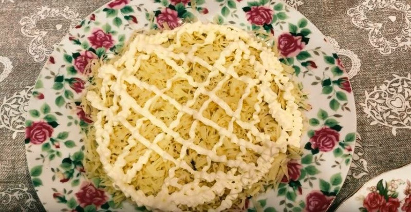2. Теперь на блюдо, где будем собирать салат, выкладываем первый слой из сыра, только кладём половину от всего объёма. Затем сверху наносим майонезную сеточку.