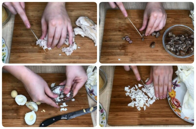 2. Когда всё приготовилось пора заниматься нарезкой. Куриное филе режем средним кубиком, сердечки нарезаем кружочками, яйца измельчаем через сетку или крошим ножом до состояния мелкого кубика и аналогичным образом поступаем с капустой.