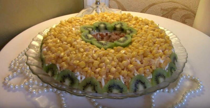 4. В завершении украшаем браслет нарезанным киви и посыпаем всё сверху консервированной кукурузой. На фото подробно видно, как должен выглядеть наш салат. В конце вынимаем стакан из середины блюда.