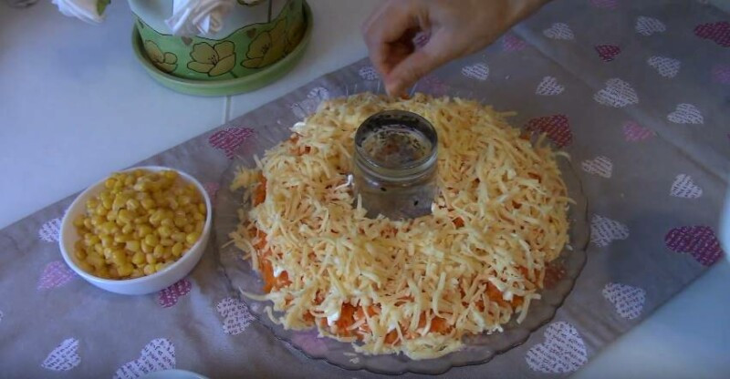 После снятия сервировочного кольца, бока салата тоже присыпаем тёртым сыром.