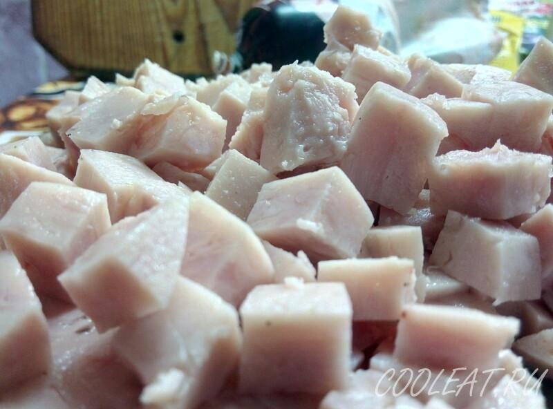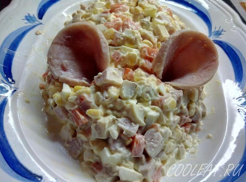 1. Ну а пока овощ и яйца варятся можно нарезать другие продукты. Первым делом крошим ветчину. Измельчаем её на маленькие кубики и сразу отправляем в основную миску, где будем замешивать салат. Также не забудьте оставить часть колбасы для украшения, а именно 2 колечка на уши и столько же на лапки и хвост.