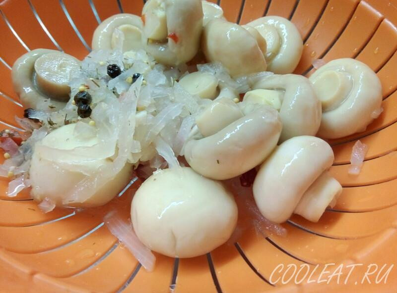 2. Шампиньоны надо отделить от маринада. Я это делаю самым обычным способом, просто вываливаю всё на дуршлаг и жду пока жидкость стечёт. Можно и не сливать рассол, если он вкусный, но дать грибам стечь надо обязательно, чтобы в итоге салат не был водянистым.