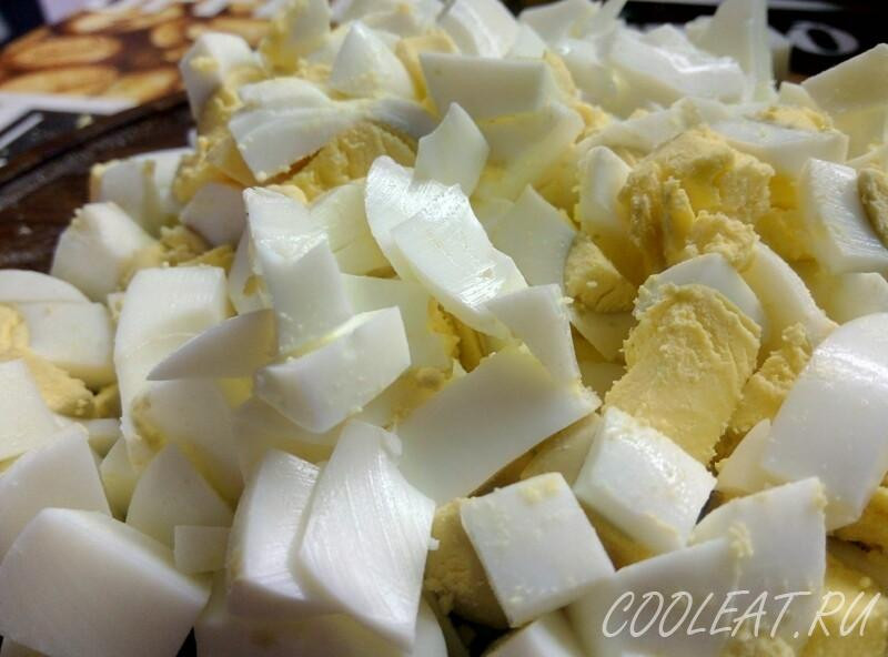 2-ой вариант – это просто из 2-х яиц достать желток и отложить в сторону, остальное просто нарезать кубиком и перемешать с другими продуктами. А в конце натереть на мелкой тёрке, что мы отложили, и украсить этим крыску. Так получиться желтая шубка.