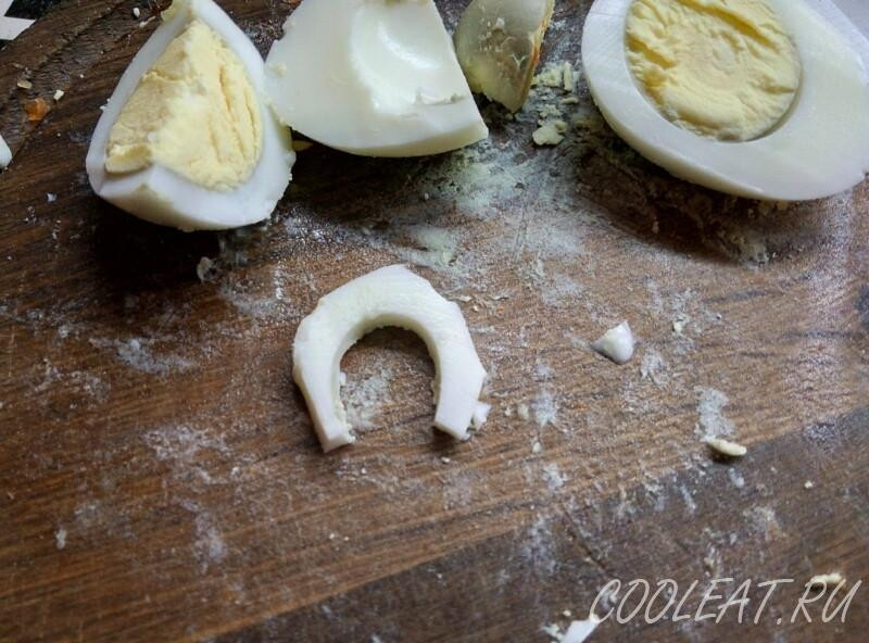 В общем вначале надо взять варенное яйцо и разрезать его пополам вдоль, а потом поперёк. Достаём желток и отрезаем от той части яйца, где больше белка, небольшую дольку, напоминающую полукруг. Далее с этой части срезаем сверху небольшой слой, дабы получилась везде почти одинаковая толщина (сверху чуть толще). Таким образом делаем ещё одну деталь глаза.
