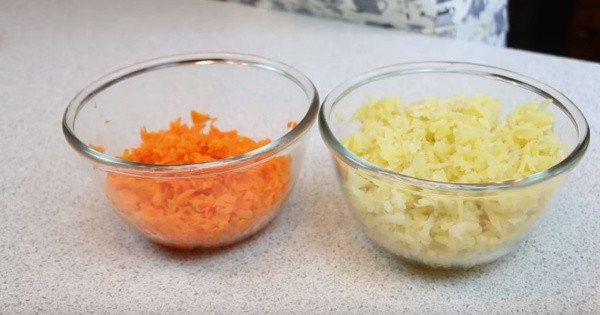 1. В первую очередь натираем овощи на крупной тёрке. Лук мелко рубим.