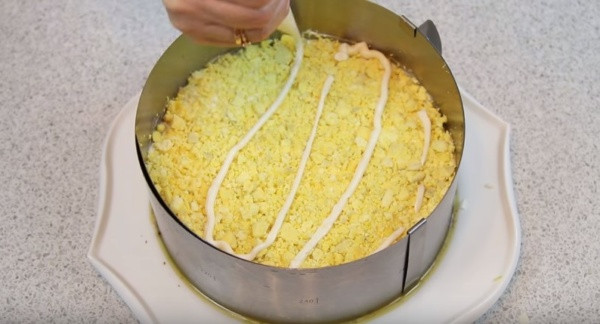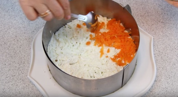 4. Следующим слоем идут яичные белки. Смазываем их майонезов и сверху выкладываем слой из моркови, также майонезим его.