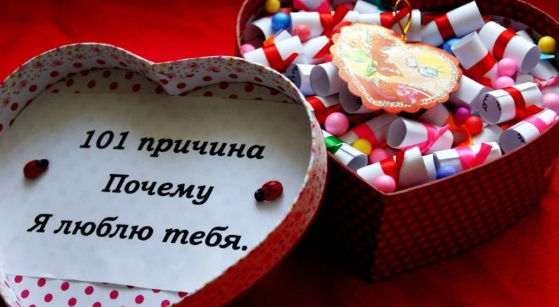 4. «101 причина почему я тебя люблю». Понадобится красивая банка или коробочка, которую можно дополнительно украсить. А во внутрь укладываются аккуратные свертки с приятными словами.