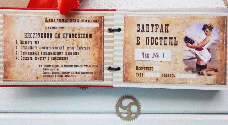 4. Чековая книжка желаний. Делается она очень просто, понадобится чистый блокнот с отрывными листочками и Ваша фантазия. Украсьте ее, подпишите и заполните. На каждом листочке напишите желание, например: поцеловать, сделать массаж, подарить незабываемую ночь любви и т. д. Не бойтесь фантазировать.