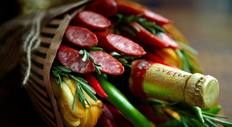 6. Букет. Но не букет цветов, а любимых лакомств настоящих мужчин. Это может быть хорошее пиво с колбасками и копченостями или любое другое наполнение. Все это заворачивается в бумагу для цветов и вуаля — букет готов.