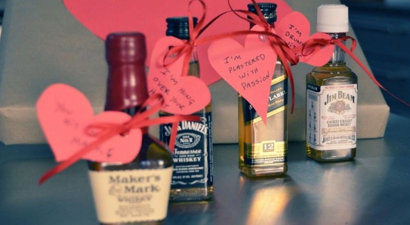 5. Элитные напитки. Они должны быть в мини версии. Для упаковки такого бара прекрасно подойдет любая коробочка, которая вместит в себя все бутылочки. Дополнить весь ансамбль можно открыткой и конфетами.