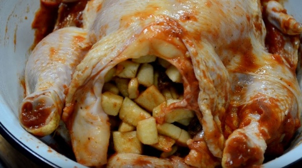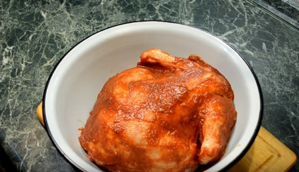 2. Приготовленным маринадом обильно промазываем каждый сантиметр курицы, в том числе и внутри. Накрываем миску, где лежит курица, пищевой плёнкой и отправляем её в холодильник на 12 часов.