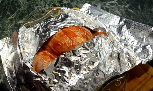 5. Застилаем дно формы для выпечки пищевой фольгой, только таким образом, чтобы краёв хватило накрыть курицу. Выкладываем курочку и закрываем её фольгой. Сверху накрываем ещё 1 слоем.