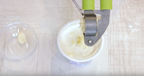 3. Чтобы сделать соус, в сметану просто выдавите чеснок и перемешайте, можете также добавить в него лимонного сока.