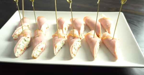 3. На край ветчины кладём начинку и сворачиваем всё рулетиком. Разрезаем пополам.