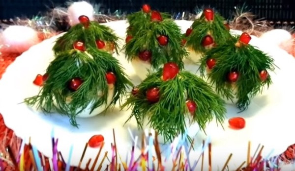 Осталось только украсить закуску укропом, имитируя ветки ёлочки. А зернами граната делаем игрушки, всё готово.