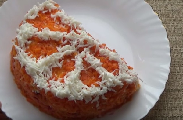 Осталось только украсить салат натёртыми белками, имитируя прожилки апельсина.