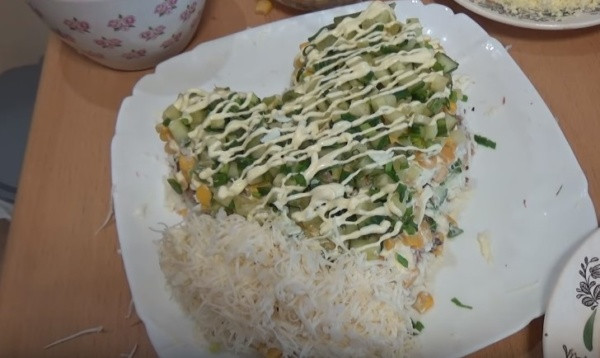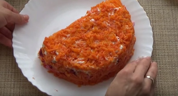 6. Подошла очередь моркови, её натираем, как и предыдущие ингредиенты, и распределяем по всему салату.