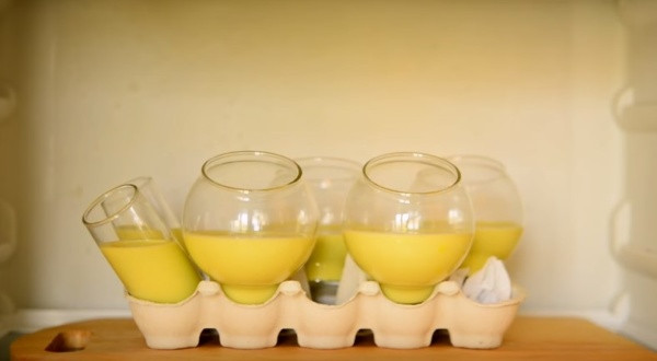 4. Устанавливаем бокалы, в которые будем подавать десерт под углом и наливаем туда Панна Котту, отправляем в холодильник до полного застывания.