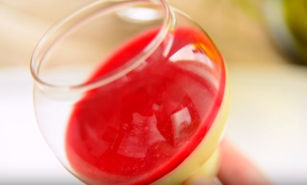 6. Достаём из холодильника застывшую Панна Котту и теперь делаем слой из клубничного желе. Здесь тоже можно поэкспериментировать с углами наклона чаши. Отправляем застывать.