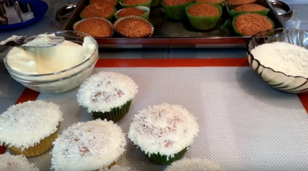 8. Теперь белым кремом смазываем верхушки кексов тонким слоем и окунаем их в кокосовую стружку, имитируя тем самым снежную полянку, где будет стоять елочка.