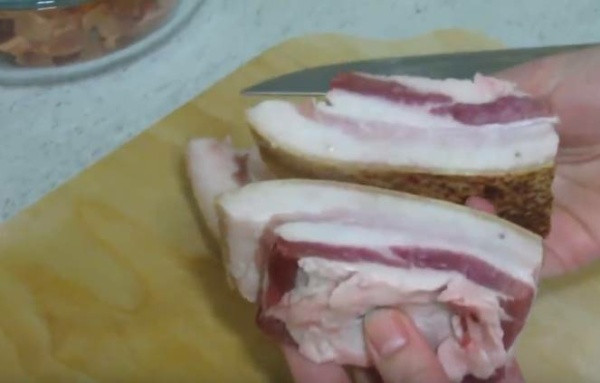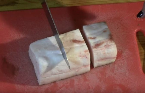 2. Пока кипятится вода, займёмся салом. Покупаем обязательно свежий продукт, не солёный. Его нарезаем кусочками по 5 см. Также если на шкурке есть налёт, его необходимо сошкрябать ножом.