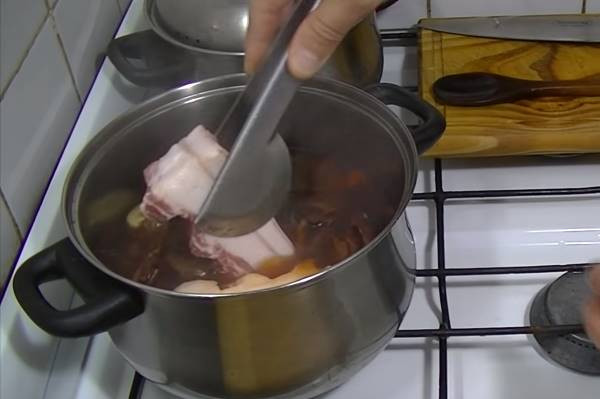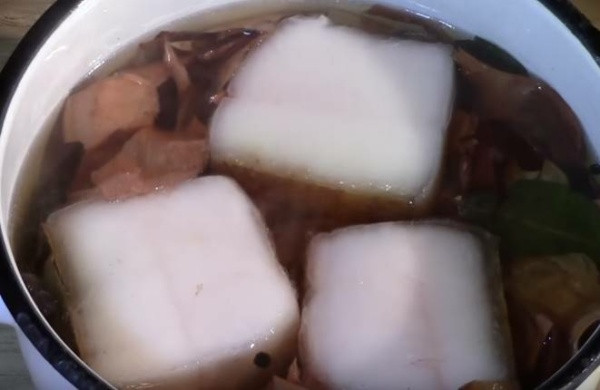 2. Когда рассол закипел в него закладываем сало. Снова ставим кастрюлю на плиту и варим продукт на протяжении 30 минут с момента закипания жидкости. Затем снимаем ёмкость с огня и оставляем шмат в рассоле просаливаться 10-12 часов. Удобнее всего поставить блюдо на ночь в холодильник.