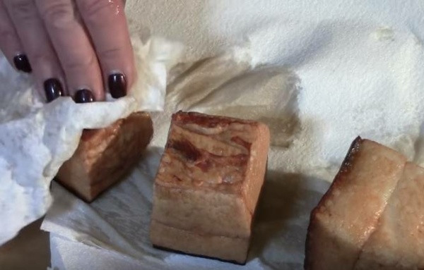 3. По прошествию заданного времени можно доставать сало из раствора. Его необходимо обсушить. Теперь можно обвалять кусочки закуски в выбранных специях. Затем надо завернуть шматы в пищевую фольгу и убрать в морозильник, чтобы они полностью заморозились.