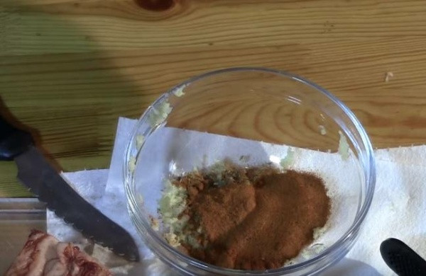 6. Готовим приправу. В небольшую ёмкость выдавливаем через пресс чеснок и к нему всыпаем все специи. Чёрного перца достаточно 1/2 ч. л., а сладкого можно добавить 2 ч. л. Смесь необходимо перемешать до однородности.