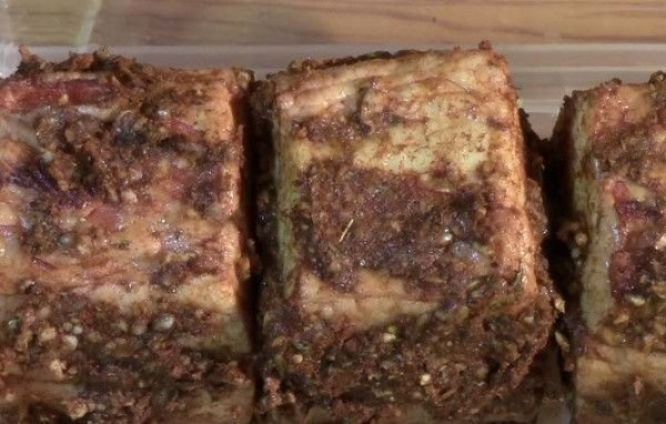 5. Спустя 12 часов, достаём кусочки из рассола, их надо обтереть от влаги и убрать прилипшую шелуху. Затем все оставшиеся специи смешиваем воедино (чеснок давим через пресс) и втираем их в сало со всех сторон. Готовое блюдо заворачиваем в пищевую плёнку или фольгу. Убираем в холодильник на 6 часов.