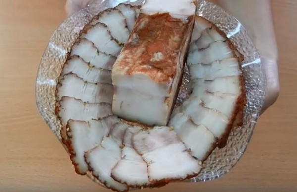 Подмороженное сало можно доставать из морозилки и нарезать. Только дайте ему немного подтаять. А так ароматную закуску пора подавать к столу. Можете ещё нарезать черный хлеб и разложить на него кусочки, сделав небольшие закусочные бутербродики.