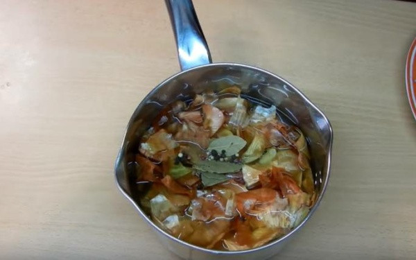 1. В кастрюлю наливаем 1 литр воды и ставим её на плиту. Доводим до кипения. Шелуху промываем от возможной грязи и отправляем в кипящую воду. Туда же закладываем лавровый лист и соль. Привариваем всё содержимое 3-5 минут.