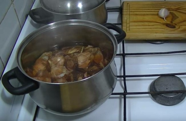 2. Ставим воду на плиту и дожидаемся пока она закипит. В кипящую жидкость закладываем луковой шелуху. Её, кстати, надо предварительно промыть, чтобы в рассоле потом не оказалось грязи.