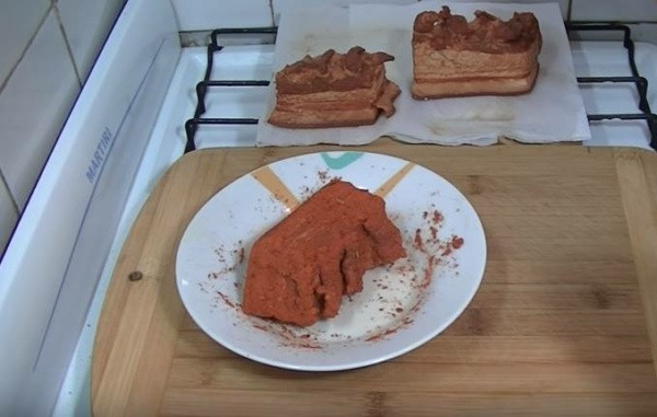 5. На следующий день вынимаем кусочки из рассола и даём им обсохнуть, либо можно промокнуть их бумажными полотенцами. Следующие действия делаются исключительно по желанию, но для разнообразия просто попробуйте. Смещайте острый перец с паприкой и обваляйте в пряностях шмат сала. Можно использовать и другие специи, всё зависит от предпочтений.