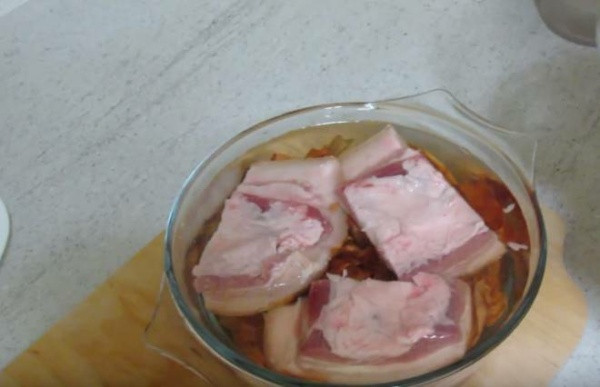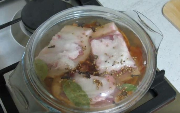 4. По истечению времени сало из рассола не достаём, даём всему этому делу остыть, а затем убираем в холодильник на 12-24 часа.