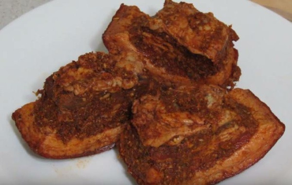 5. На следующий день можно доставать шматы из рассола. Выкладываем из на бумажные полотенца и просушиваем. Это делается для того, чтобы во время натирания кусочков специями, приправы не стекли.